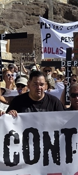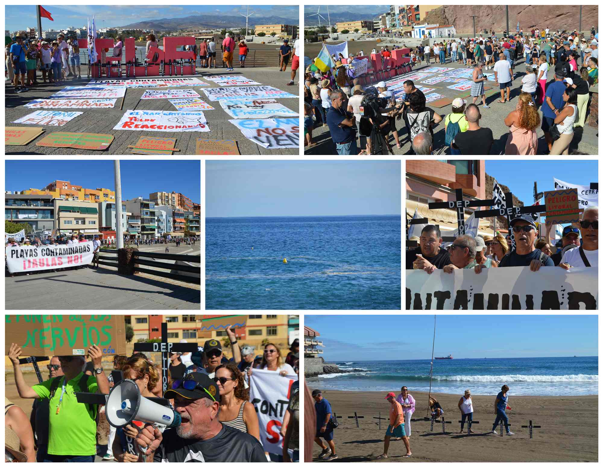 • En las imágenes se aprecia una concentración con pancartas, cruces negras, megáfonos y recorrido costero, pero no hay densidad suficiente para justificar esa cifra.