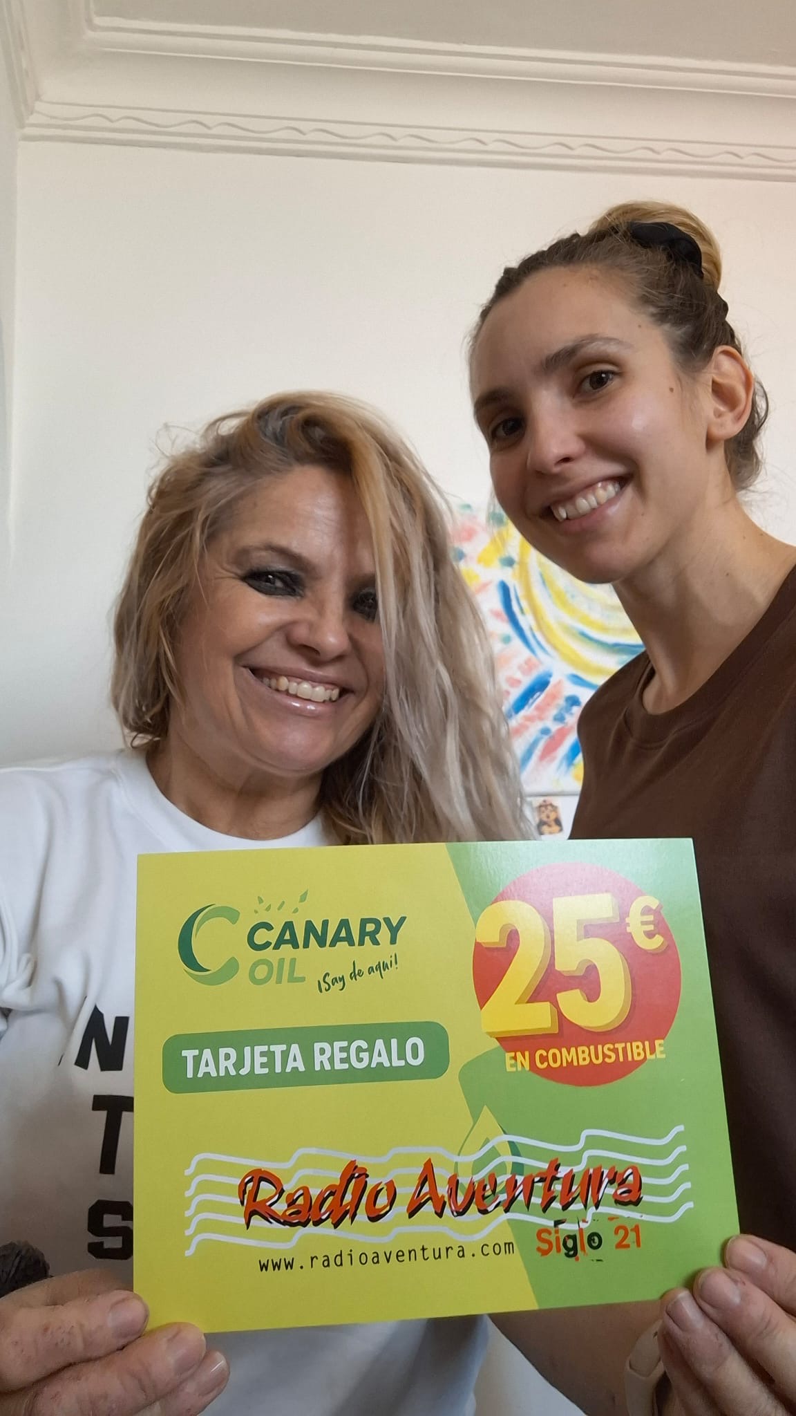 Dos oyentes contentas posan con el vale por valor de 25 € entregado por Radio Aventura Siglo, en colaboración con CANARY OIL
