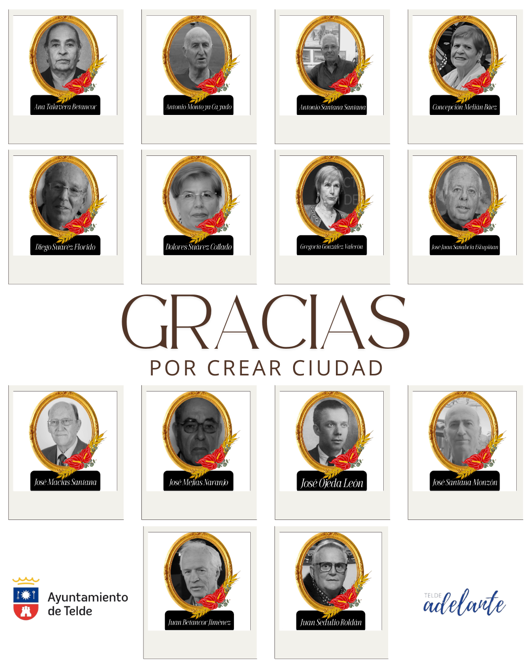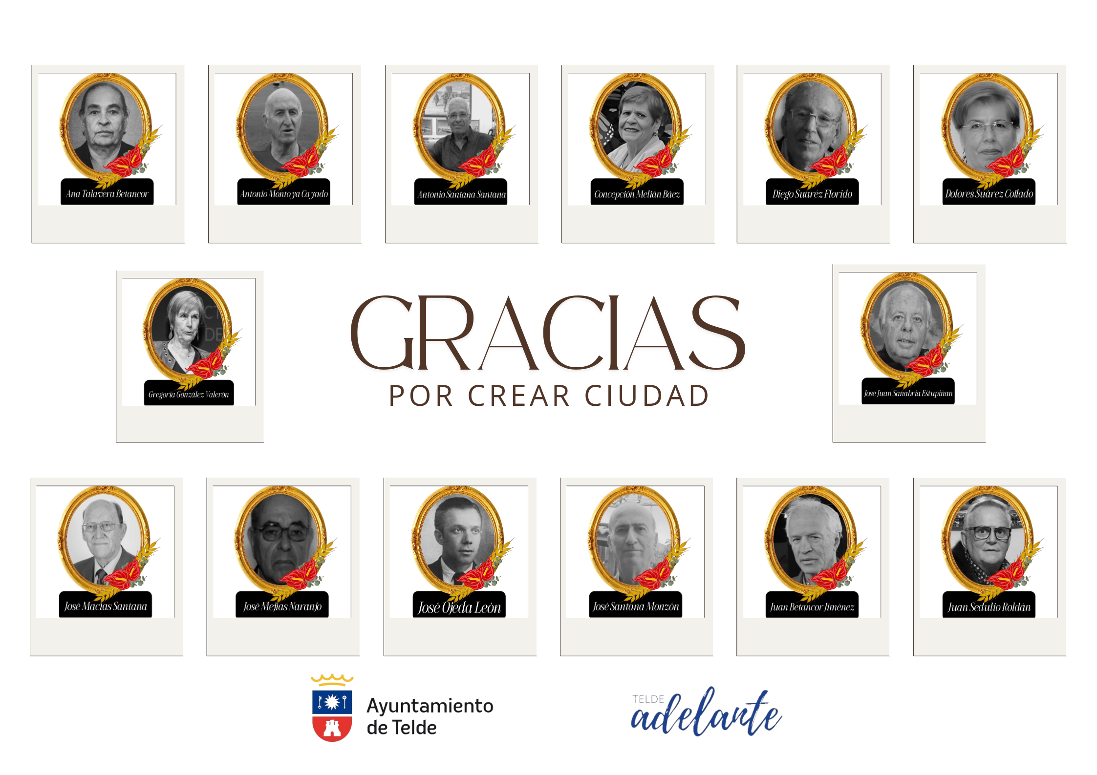 Las personas homenajeadas son Antonio Montoya Cayado, Ana Talavera Betancor, Antonio Santana Santana, Concepción Melian Báez, José Mejías Naranjo, José Juan Sanabria Estupiñán, Gregorio González Valerón, Dolores Suárez Collado, Diego Suárez Florido, José Macías Santana, Juan Sedulio Roldán, Juan Betancar Jiménez, José Ojeda León y José Santana Monzón.