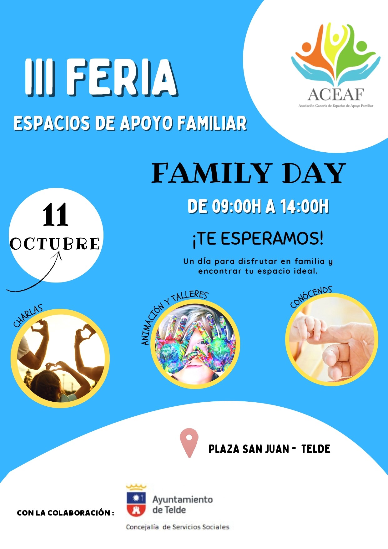 La Plaza de San Juan será este sábado el escenario de la III Feria de Apoyo Familiar Family Day, una jornada dedicada al bienestar de la primera infancia y al fortalecimiento de los vínculos familiares. El evento, impulsado por la Concejalía de Servicios Sociales del Ayuntamiento de Telde y organizado por la Asociación Canaria de Espacios de Apoyo Familiar (ACEAF), se desarrollará de 9:00 a 14:00 horas con acceso libre y gratuito.
