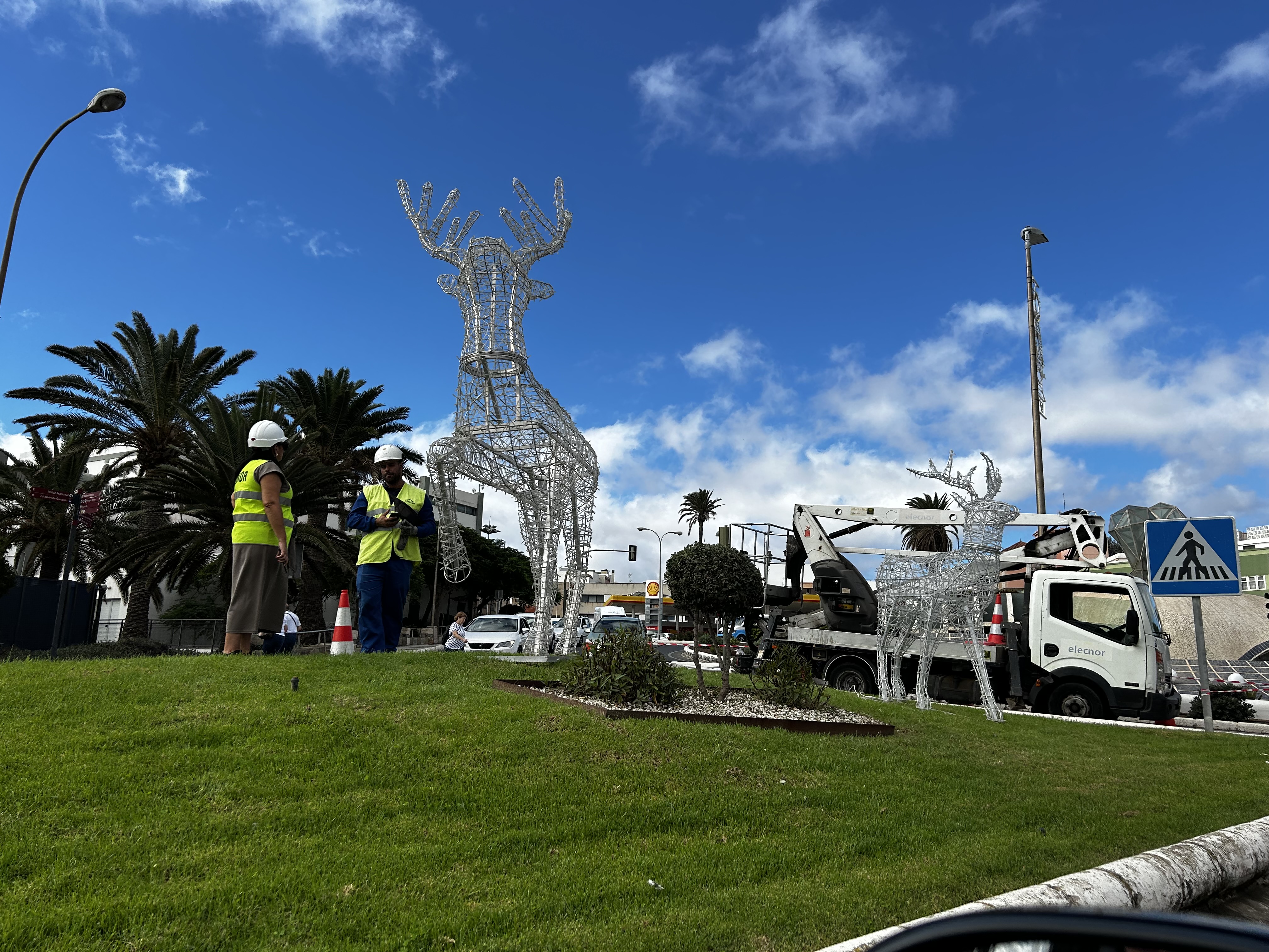 Esta mañana, uno de los puntos intervenidos fue el área frente a la rotonda Daora, donde se colocaron grandes figuras de renos metálicos con luces LED, captando la atención de vecinos y conductores. Pero esta escena se repite por todo el municipio: desde Jinámar hasta San Juan, pasando por El Goro, La Herradura y San Gregorio, las estructuras decorativas ya empiezan a transformar el paisaje urbano.